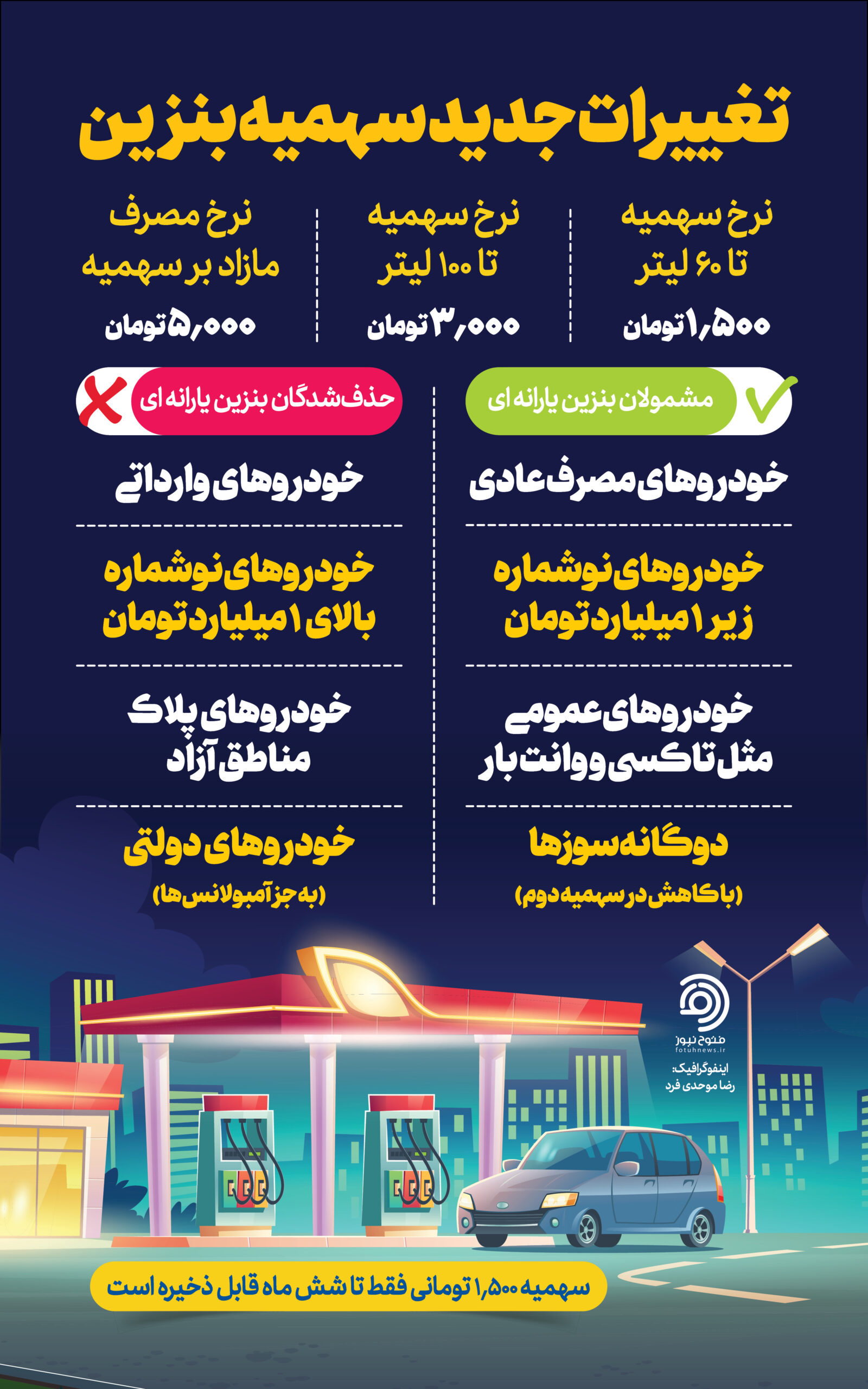 به گزارش پایگاه خبری فتوح نیوز،در این طرح، نرخهای متفاوتی برای مصرف سهمیهای و مازاد در نظر گرفته شده و خودروها بر اساس نوع، قیمت و کاربریشان مشمول یا محروم از بنزین یارانهای شدهاند.